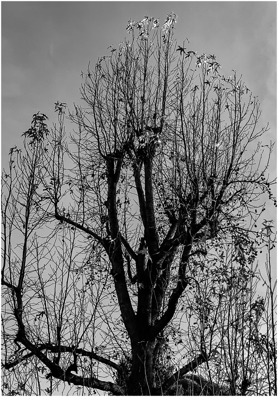 A plethora of limbs backed up by a gray sky! Last leaves of fall hanging on.